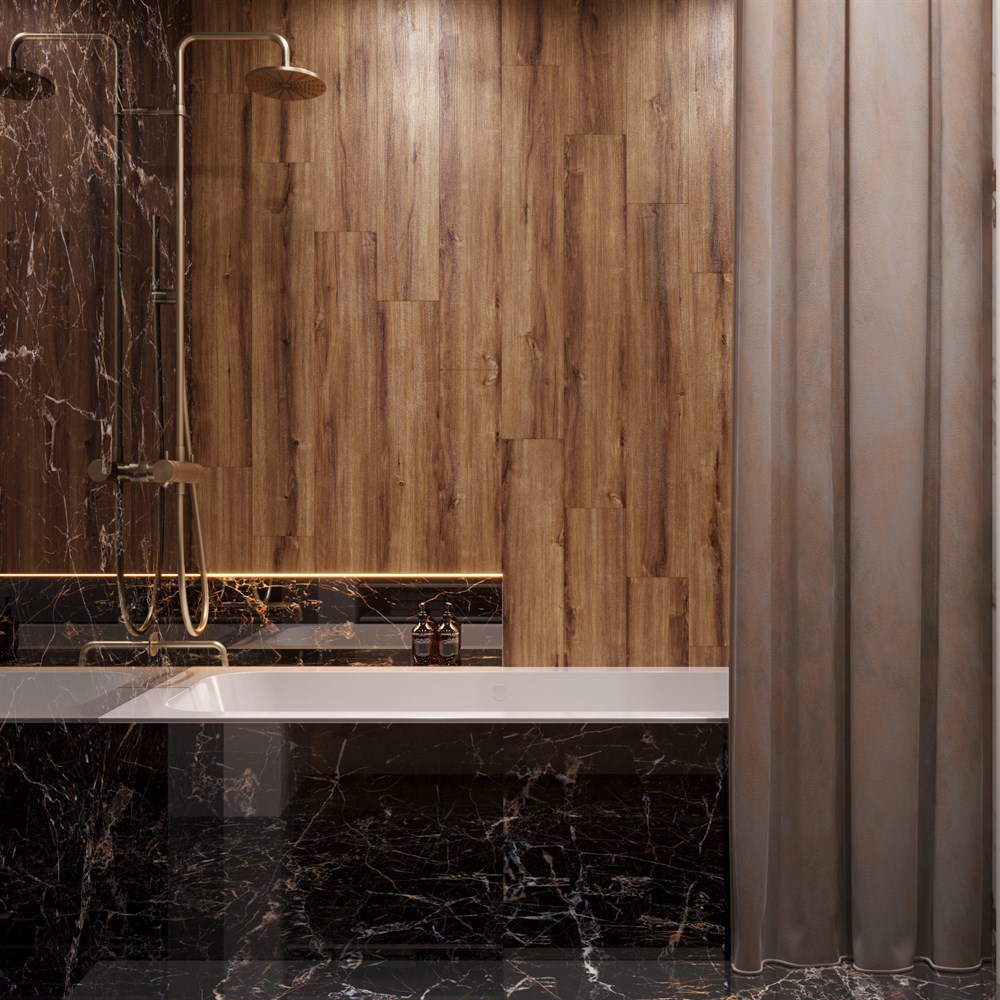 Поверхность с деликатно выраженным рельефом передает тактильные ощущения натуральной древесины — каждая линия, каждый узел тщательно проработаны, создавая полную иллюзию ценного массива. Насыщенный коричневый цвет с медными переливами придает интерьеру особый шарм и статусность, будь то классический кабинет или респектабельный ресторан. Особенность AKASA WOOD MAHOGANY — его удивительная способность сочетать в себе визуальную теплоту натурального дерева с исключительной практичностью. Материал абсолютно устойчив к влаге, не выцветает со временем и сохраняет безупречный вид даже при интенсивной эксплуатации. При этом он удивительно точно воспроизводит игру света на поверхности древесины, создавая живую, дышащую текстуру дерева, освобождая от необходимости сложного ухода.