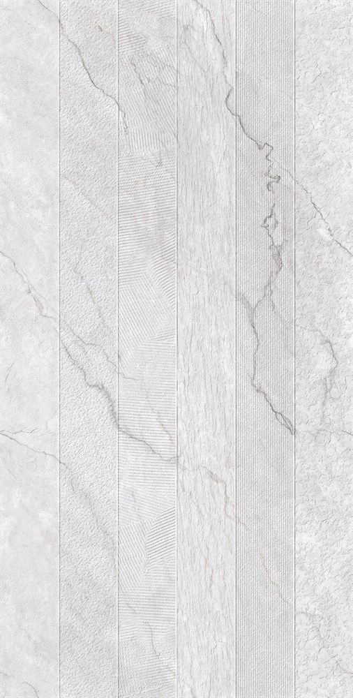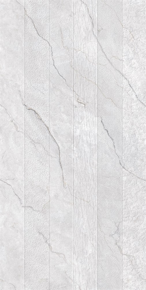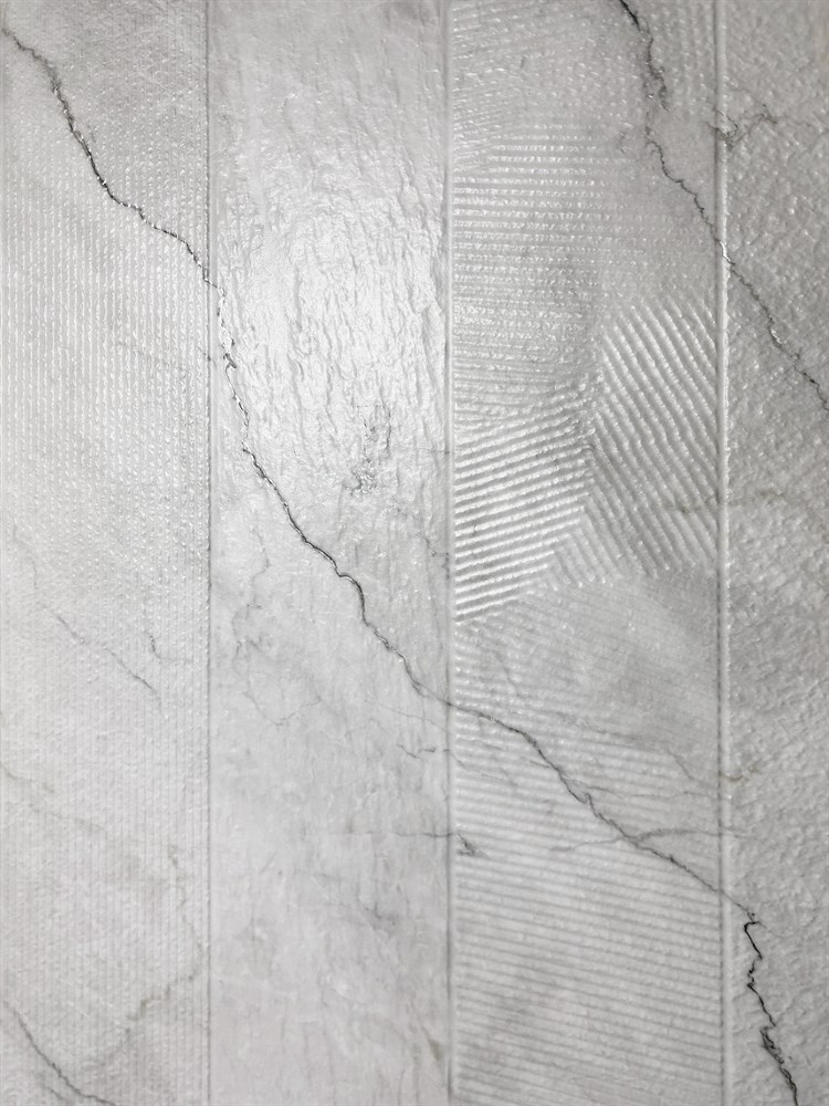 Матовая белоснежная поверхность служит идеальным фоном для изысканных металлизированных прожилок, которые оживают при взаимодействии со светом. Эти переливающиеся акценты создают эффект глубины и движения, наполняя пространство динамичной игрой бликов. Особую выразительность материалу придает оригинальная фактура — рельефная поверхность не просто имитирует природный камень, но и добавляет интерьеру тактильную привлекательность.