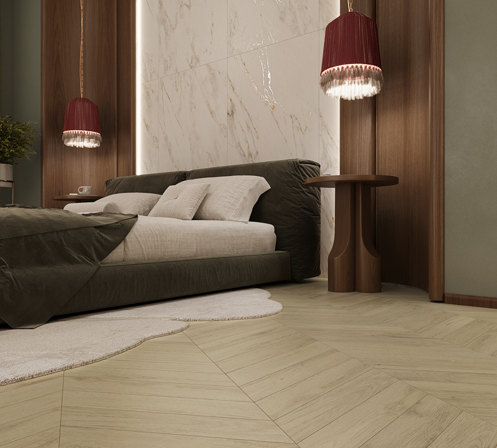 SUNWOOD MAPLE — керамогранит под дерево с мягким бежево-кремовым оттенком светлого клёна. Текстура передаёт тонкий, изящный рисунок древесных волокон с едва заметными переливами тона, создающими ощущение солнечного света и натуральной лёгкости. Поверхность матовая, что усиливает визуальную теплоту и приятную тактильность покрытия.